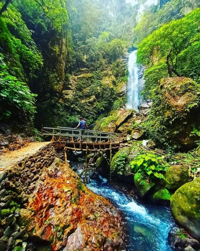 Keindahan air terjun yang dikelilingi oleh hutan yang rimbun menciptakan pemandangan yang memanjakan mata dan suasana yang damai.