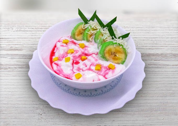 Sajian ini terbuat dari bahan utama pisang yang dibalut dengan adonan tepung yang diberi pewarna hijau alami. Pewarna hijau ini terbuat dari daun pandan dan daun suji. Selain itu, hidangan ini biasanya disajikan bersama bubur sumsum yang lembut dan sirup berwarna merah.