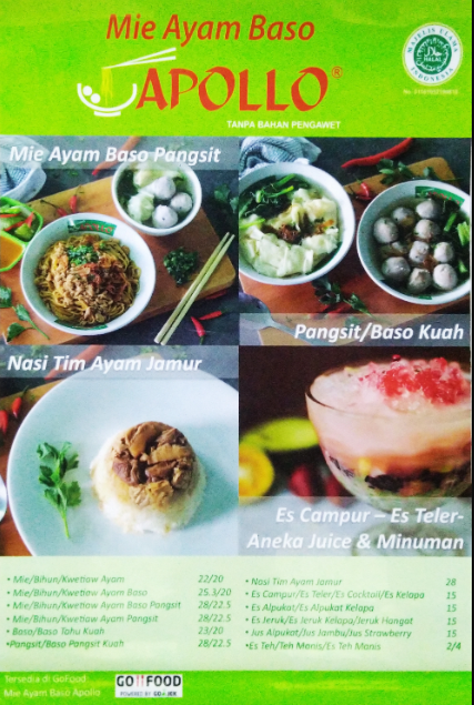 Mie ayam bakso ini memang sudah tersohor. Terang saja, usianya juga sudah sekitar 21 tahun. Seporsi mie ayam disajikan bersama semangkuk kecil bakso dan sayur. Rasa gurih dan manis mie nya sangat terasa, ditambah taburan daging ayam cincang dan bawang goreng. Kuah kaldu serta sedapnya bakso menambah lahap menyantap seporsi mie ayam dari makanan enak Bogor Mie ayam Apollo ini. Anda tidak perlu menunggu lama untuk menyantap seporsi mie ayam bakso ini, penyajian yang cepat membuat konsumen juga suka makan di kedai ini.