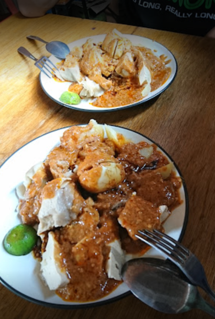 Letak perbedaannya, pada penyajiannya yang menggunakan saus kacang kental, gurih dan nikmat. Semakin menggugah selera lagi dengan bahan pelengkap lainnya, seperti telur rebus, kubis, kentang, dan pare kukus.